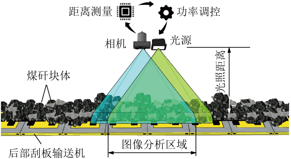 因此,我們提出了一種基于立體視覺的照度智能監(jiān)測(cè)與自適應(yīng)調(diào)節(jié)方法,為圖像識(shí)別智能放煤技術(shù)提供最優(yōu)照度。在放頂煤工作面,利用圖像深度信息確定光照距離,配合功率監(jiān)測(cè)確定實(shí)時(shí)照度,進(jìn)而通過調(diào)節(jié)功率獲得最佳照度,然后在最佳照度下對(duì)圖像進(jìn)行采集和識(shí)別,實(shí)現(xiàn)了圖像識(shí)別智能放煤過程中的照度自適應(yīng)調(diào)節(jié)。實(shí)際上,如果相機(jī)和光源并列放置,那么可以直接用圖像深度近似代替光照距離。而如果分散布置,則也可以通過幾何關(guān)系換算確定光照距離。