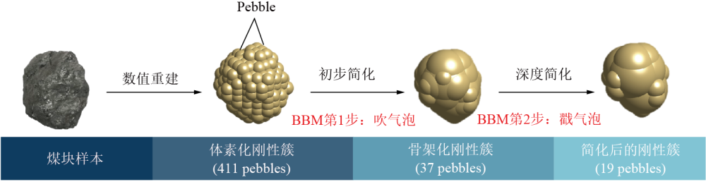 為了區(qū)別于精準(zhǔn)重建方法,將這種方法稱為寫意重建,寫意重建又有別于完全隨機(jī)的重建,因?yàn)樗窃谛螤钐卣鲄?shù)的主動(dòng)干預(yù)下完成的重建,所以具有一定可重復(fù)性和科學(xué)性。重建后的塊體是由若干pebble組成的體素化剛性簇,體素化剛性簇的分辨率(或體素尺寸)影響到塊體細(xì)節(jié)表征效果,分辨率越高(即體素尺寸越?。?,細(xì)節(jié)表征越好,但用到的pebble數(shù)量也越多,會(huì)在一定程度上影響運(yùn)算效率;反之分辨率越低,犧牲了部分細(xì)節(jié)特征,但是有利于提高運(yùn)算效率。因此如何在保證重建精度的前提下,有效減少pebble數(shù)量,是提高運(yùn)算效率的關(guān)鍵。為此,提出了一種有效的方法來優(yōu)化完善上述重建過程,即氣泡破裂法(Bubble burst method, BBM),主要包括吹氣泡和戳氣泡兩個(gè)過程。