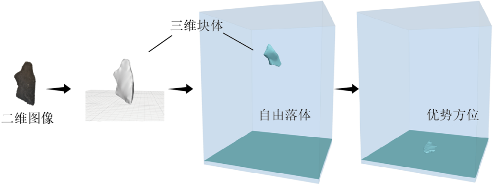 二維形態(tài)特征與圖像采集的視角有關(guān),即不同視角下的煤矸塊體的二維形態(tài)特征不同,所以,在分析煤矸塊體二維特征的時(shí)候,需要首先確定觀察視角。在放頂煤工作面,從放煤口放出煤矸塊體在經(jīng)過放落、碰撞后,會(huì)傾向于以優(yōu)勢(shì)方位(Preferred orientation)堆積在后部刮板運(yùn)輸機(jī)上。因此,有必要確定對(duì)后部刮板輸送機(jī)上的煤矸塊體的觀察視角,而不是隨意觀察,在優(yōu)勢(shì)方位下提取的形狀特征才有意義?;谶@一假設(shè),利用多視圖像序列精準(zhǔn)重建了煤矸塊體模型,用離散元法進(jìn)行了自由落體數(shù)值計(jì)算,確定了具有不同形狀特征參數(shù)塊體的優(yōu)勢(shì)方位。