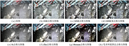 此外,還提出了一種空頻域聯(lián)合強(qiáng)化去粉塵算法,并在朱仙莊礦進(jìn)行了測(cè)試。與其他算法相比,所提算法具有更好的去粉塵能力,可以保留更多的細(xì)節(jié),同時(shí)抑制噪聲和光干擾的能力也更強(qiáng)。近年來,一些更智能的算法也被提出并實(shí)現(xiàn)了更好的粉塵(或水霧)去除性能。