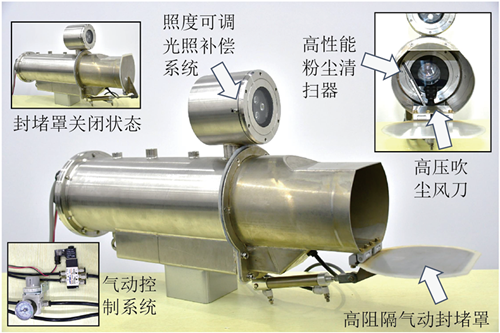 吸附在相機(jī)鏡頭上的吸附塵,主要包括吸附煤塵和吸附巖塵。對(duì)于這類粉塵的處理,圍繞井下惡劣環(huán)境開展技術(shù)攻關(guān),并與安徽中科光電色選機(jī)械有限公司合作,于2020年研制出能夠適應(yīng)井下高濃度粉塵、水霧環(huán)境、具有數(shù)據(jù)獨(dú)立處理功能的圖像采集系統(tǒng)第一代原理樣機(jī)—“慧眼一號(hào)(Insight-I)”?;谌梭w仿生學(xué)以及邊緣AI技術(shù),分別模仿眨眼、揉眼、吹灰等動(dòng)作,通過高阻隔氣動(dòng)封堵罩、高性能粉塵清掃器、高壓吹塵風(fēng)刀,實(shí)現(xiàn)圖像采集系統(tǒng)粉塵自主感知與清除功能,并實(shí)現(xiàn)了在圖像采集端完成數(shù)據(jù)處理工作,降低了數(shù)據(jù)傳輸壓力,提升了系統(tǒng)可靠性和響應(yīng)速度。
