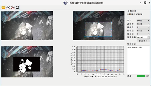 基于上述圖像識(shí)別智能放煤技術(shù)基本原理,進(jìn)一步研發(fā)了圖像識(shí)別智能放煤在線監(jiān)測(cè)軟件,圖像處理速度25幀/s,實(shí)時(shí)計(jì)算混矸率數(shù)據(jù),當(dāng)混矸率超過預(yù)定的區(qū)間混矸率閾值時(shí),通過通信模塊自動(dòng)發(fā)送中止放煤或者關(guān)閉當(dāng)前放煤口、開啟下一放煤口的指令給控制系統(tǒng)。