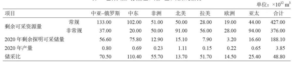 表 1 世界天然氣資源量、儲產(chǎn)量和儲采比情況