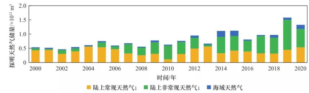 圖 1 我國天然氣新增探明儲量構(gòu)成圖(2000—2020年)