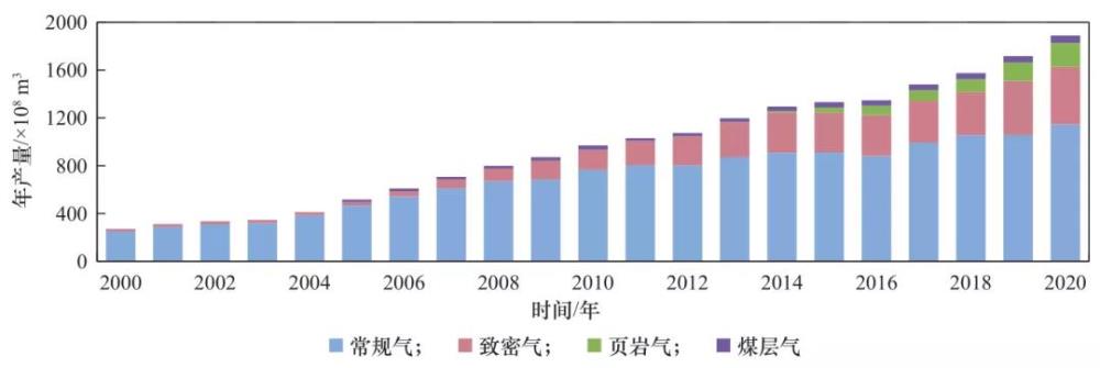 圖 2 我國天然氣產(chǎn)量構(gòu)成圖(2000—2020 年)