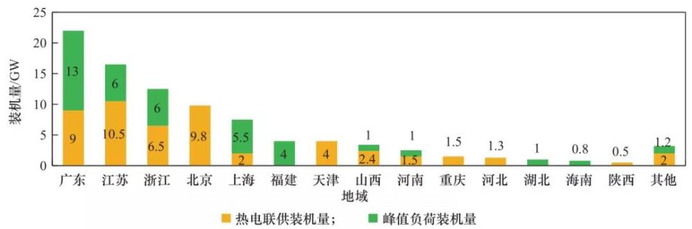 ③天然氣發(fā)電效率高,在熱電聯(lián)產(chǎn)發(fā)電時的能源利用率可達 80%,遠超普通發(fā)電機組的 30%。截至 2020 年 10 月,我國燃氣電廠主要有熱電聯(lián)供、峰值負荷(調(diào)峰)兩類機組裝機類型,裝機量及地域分布情況如圖 3 所示;總裝機量為 97 GW,含調(diào)峰機組 39.5 GW(占比為 41%),全年發(fā)電用天然氣達到 5.71×1010 m3 。隨著空氣污染防治持續(xù)推進和可再生能源大規(guī)模介入,電力調(diào)峰需求規(guī)模日益增大,以調(diào)峰電廠為主的燃氣發(fā)電有望迎來大發(fā)展。