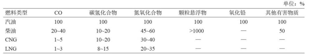 注:以汽油的污染物排放情況作為對照標準,設(shè)為1(100%);其他燃料的污染物排放情況以汽油作為參考。