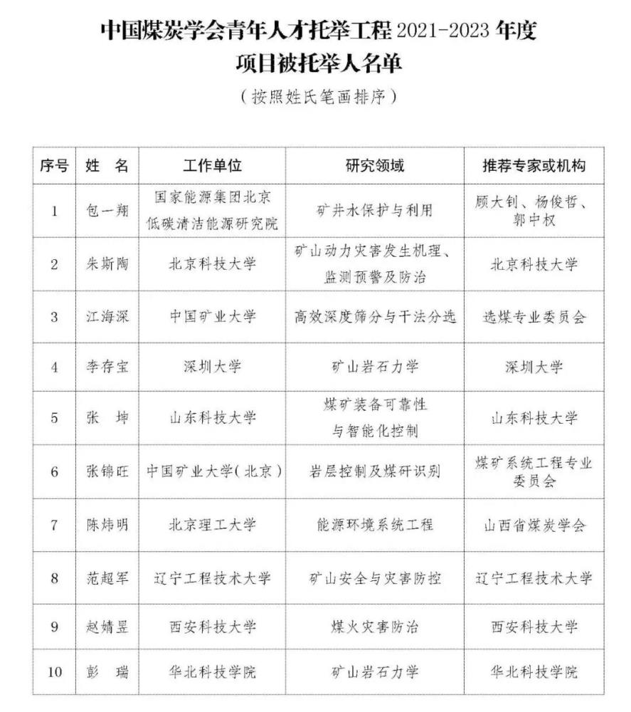 按照《中國(guó)科協(xié)青年人才托舉工程實(shí)施管理細(xì)則(修訂)》(科協(xié)創(chuàng)函會(huì)字〔2021〕30號(hào))有關(guān)要求,根據(jù)《中國(guó)科協(xié)青年人才托舉工程管理辦法》和《中國(guó)煤炭學(xué)會(huì)青年人才托舉工程管理辦法(暫行)》有關(guān)規(guī)定,通過學(xué)會(huì)分支機(jī)構(gòu)、省級(jí)煤炭學(xué)會(huì)、理事會(huì)員單位以及專家實(shí)名等多種渠道推薦,經(jīng)過資格審查、盲評(píng),于2022年1月24日,中國(guó)煤炭學(xué)會(huì)召開青年人才托舉工程2021-2023年度(第七屆)項(xiàng)目被托舉人遴選評(píng)審會(huì),評(píng)選出包一翔等10名同志為中國(guó)煤炭學(xué)會(huì)第七屆中國(guó)科協(xié)青年人才托舉工程項(xiàng)目被托舉人。