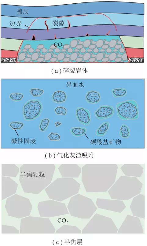 根據(jù)上述思路,王雙明院士在對(duì)煤炭開(kāi)采擾動(dòng)空間地質(zhì)特點(diǎn)分析的基礎(chǔ)上,探究了煤炭開(kāi)采擾動(dòng)空間高效封存CO2的必備條件,提出了適宜于煤礦開(kāi)采過(guò)程中進(jìn)行CO2封存的3種潛在技術(shù):煤層采空區(qū)碎裂巖體CO2封存技術(shù)、煤地下氣化煤灰及碎裂巖體CO2封存技術(shù)、煤原位熱解半焦CO2封存技術(shù),并分別對(duì)上述技術(shù)對(duì)應(yīng)的封存理念、技術(shù)途徑及技術(shù)難題進(jìn)行了討論。