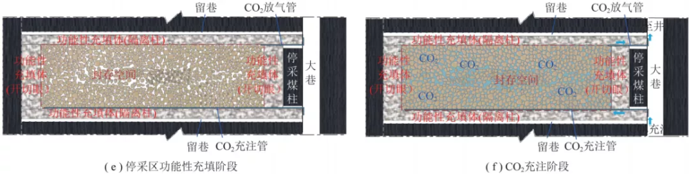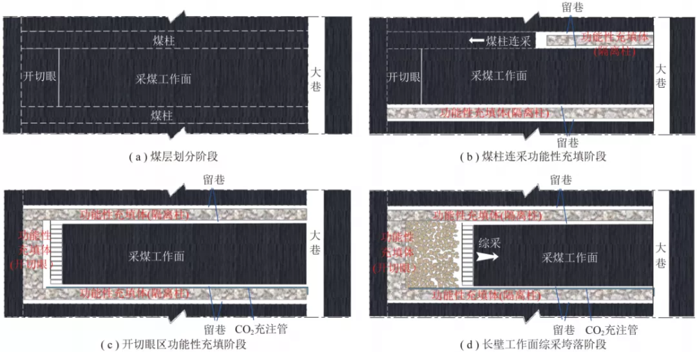 技術(shù)途徑:煤層采空區(qū)碎裂巖體CO2封存技術(shù)分為6個(gè)階段,具體包括煤層劃分、煤柱功能性充填回采、開(kāi)切眼區(qū)充填、長(zhǎng)壁工作面垮落開(kāi)采、停采區(qū)功能性充填和CO2充注階段。