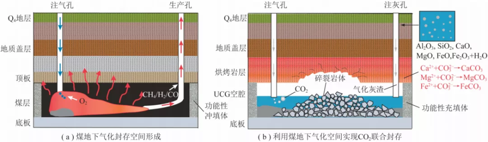 技術(shù)途徑:本研究所提的CO2封存模式是指綜合利用UCG形成的地下空間和殘余物質(zhì)實(shí)現(xiàn)的一種以化學(xué)封存(永久封存)為主,兼用物理封存。化學(xué)封存主要是利用氣化灰渣(也可利用發(fā)電廠(chǎng)的粉煤灰)中大量的堿土金屬氧化物水化后的金屬陽(yáng)離子,與CO2溶于水形成的碳酸根離子發(fā)生碳酸化反應(yīng),生成可用于永久封存的碳酸鹽類(lèi)物質(zhì);物理封存是利用UCG形成的空腔和上覆巖體垮落物等形成的空隙吸附CO2。