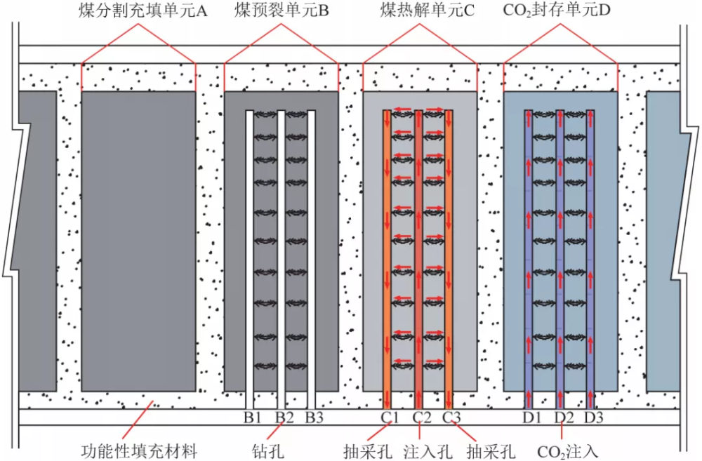 技術(shù)途徑:井工式富油煤原位熱解半焦CO2封存技術(shù)主要包括4個(gè)階段:煤層分割充填階段,煤層預(yù)裂階段,煤層熱解階段,CO2充注階段。
