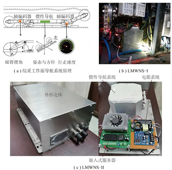 長(zhǎng)壁綜采工作面導(dǎo)航系統(tǒng)基本原理是,利用安裝于采煤機(jī)機(jī)身的具有自動(dòng)尋北功能的慣性導(dǎo)航裝置測(cè)量采煤機(jī)機(jī)身的運(yùn)行方位與姿態(tài)、采煤機(jī)行走部軸編碼器和截割部軸編碼器測(cè)量的行走距離和搖臂擺角,通過(guò)相關(guān)算法實(shí)現(xiàn)采煤機(jī)在工作面煤層中的定位,獲得采煤機(jī)的運(yùn)行軌跡和截割軌跡。LMWNS-II由慣性導(dǎo)航系統(tǒng)、嵌入式服務(wù)器和電源系統(tǒng)構(gòu)成。