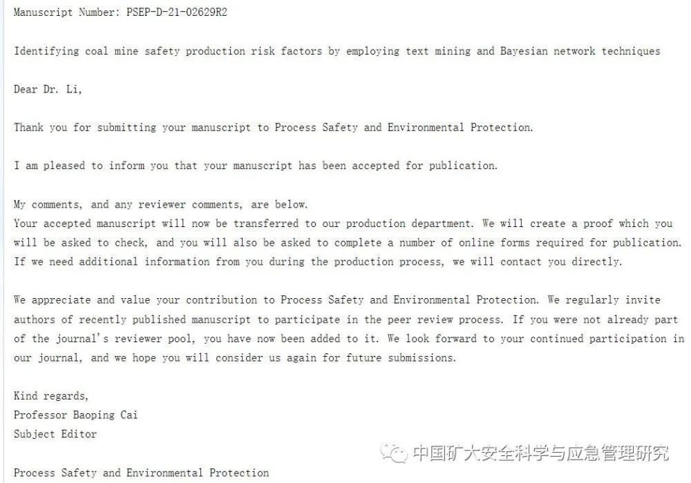 原創(chuàng)論文1:Identifying coal mine safety production risk factors by employing text mining and Bayesian network techniques被安全科學領域SCI一區(qū)高引期刊Process Safety and Environmental Protection錄用。該期刊是主要研究風險評估與可靠性工程、技術(shù)安全和損失預防、工業(yè)危害與安全案例、資源及廢物管理等問題的國際權(quán)威期刊,影響因子6.2。