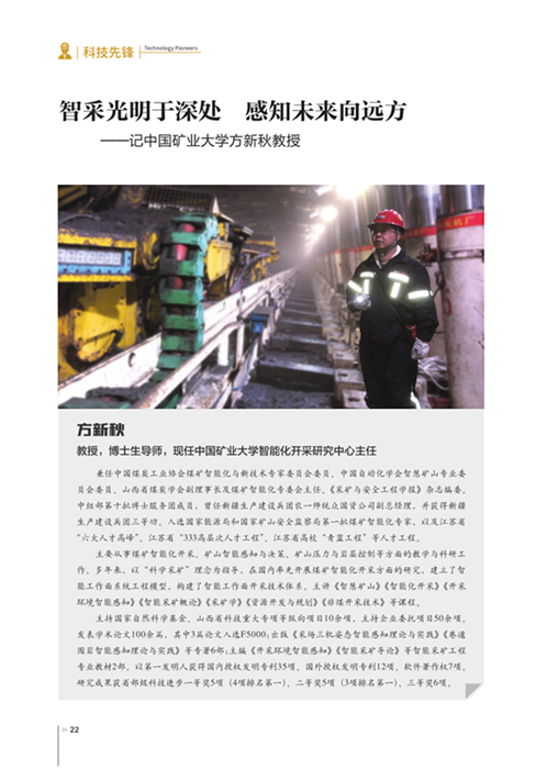 “方新秋博士多年來(lái)一直從事采礦教學(xué)與科研工作,長(zhǎng)期致力于智能化、無(wú)人化安全開(kāi)采技術(shù)研究與實(shí)踐,在國(guó)內(nèi)外率先建立了智能工作面系統(tǒng)工程模型,經(jīng)過(guò)多年的集成創(chuàng)新與應(yīng)用探索,將傳統(tǒng)煤炭開(kāi)采科學(xué)技術(shù)與現(xiàn)代信息技術(shù)深度融合,在開(kāi)采環(huán)境智能感知、采場(chǎng)空間災(zāi)害監(jiān)測(cè)預(yù)警等方面進(jìn)行了深入研究。” 中國(guó)工程院袁亮院士在方新秋的專(zhuān)著《采場(chǎng)三機(jī)姿態(tài)智能感知理論與實(shí)踐》序言中寫(xiě)下如此評(píng)價(jià)。自2008年發(fā)表第1篇智能化開(kāi)采方面的論文以來(lái),方新秋一直致力于煤礦智能化開(kāi)采、礦山開(kāi)采智能感知與決策方面的研究,逐步形成了“跨學(xué)科-組團(tuán)隊(duì)-強(qiáng)聯(lián)合”的團(tuán)隊(duì)發(fā)展思路,組建了“學(xué)術(shù)帶頭人—骨干成員—一般成員”梯隊(duì)結(jié)構(gòu)的安全智能開(kāi)采教學(xué)科研創(chuàng)新團(tuán)隊(duì),專(zhuān)業(yè)涉及采礦工程、機(jī)械工程、通信及信息處理、測(cè)控技術(shù)與儀器、計(jì)算機(jī)科學(xué)與技術(shù)、智能控制、光纖通信等學(xué)科背景,具有扎實(shí)的理論基礎(chǔ)和多年從事科研工作的實(shí)踐經(jīng)驗(yàn),成果豐碩。在錢(qián)鳴高院士的指導(dǎo)下,方新秋教授團(tuán)隊(duì)首次提出了“以智能工作面首采保護(hù)層,多維時(shí)空抽采鄰近層卸壓瓦斯”的核心理念,攻克了高瓦斯煤層群安全智能開(kāi)采關(guān)鍵技術(shù)難題,并在華晉焦煤有限責(zé)任公司沙曲煤礦得到成功應(yīng)用,相關(guān)轉(zhuǎn)化成果獲得了我國(guó)工業(yè)領(lǐng)域最高獎(jiǎng)——中國(guó)工業(yè)大獎(jiǎng)。同時(shí),跟隨錢(qián)鳴高院士“科學(xué)采礦”理念的指引,沿著智能化開(kāi)采之路,“長(zhǎng)壁工作面采煤機(jī)自主定位系統(tǒng)關(guān)鍵技術(shù)研究”“薄煤層開(kāi)采關(guān)鍵技術(shù)與裝備”“基于光纖捷聯(lián)慣導(dǎo)的長(zhǎng)壁工作面采煤機(jī)運(yùn)行姿態(tài)感知研究”等國(guó)家級(jí)項(xiàng)目陸續(xù)完成或開(kāi)展,并被總結(jié)為獨(dú)具特色的智能工作面開(kāi)采成套技術(shù)體系和煤礦開(kāi)采光纖智能感知成套裝備與技術(shù)。1)智能工作面開(kāi)采成套技術(shù)體系。智能工作面開(kāi)采技術(shù)是智能開(kāi)采的關(guān)鍵組成部分,針對(duì)當(dāng)前智能開(kāi)采的技術(shù)瓶頸,方新秋教授團(tuán)隊(duì)對(duì)工作面“三機(jī)”姿態(tài)的智能感知技術(shù)進(jìn)行了深入研究,首次構(gòu)建了智能工作面開(kāi)采成套技術(shù)體系。開(kāi)發(fā)了智能工作面采煤機(jī)自主定位技術(shù)與系統(tǒng),建立了系統(tǒng)誤差補(bǔ)償模型,研發(fā)了導(dǎo)航降誤與系統(tǒng)誤差處理技術(shù),提高了采煤機(jī)定位精度;構(gòu)建了采煤機(jī)動(dòng)力學(xué)模型與自動(dòng)移架約束模型,實(shí)現(xiàn)了采煤機(jī)姿態(tài)的實(shí)時(shí)檢測(cè)與支架的自動(dòng)化跟機(jī);基于液壓支架運(yùn)動(dòng)學(xué)原理,建立了液壓支架姿態(tài)感知理論與技術(shù)體系,結(jié)合液壓支架頂梁回轉(zhuǎn)角、支架姿態(tài)與工作阻力關(guān)系、支架?chē)鷰r耦合關(guān)系,以及支架穩(wěn)定性特征,明確了液壓支架姿態(tài)感知指標(biāo)體系及安全范圍,借助神經(jīng)網(wǎng)絡(luò)與多傳感融合算法,實(shí)現(xiàn)了支架姿態(tài)對(duì)頂板運(yùn)動(dòng)狀態(tài)、礦壓強(qiáng)度、支架穩(wěn)定性、支架關(guān)鍵結(jié)構(gòu)工況等實(shí)時(shí)監(jiān)測(cè);采用回采巷道集中控制技術(shù)實(shí)現(xiàn)了智能工作面安全高效開(kāi)采。