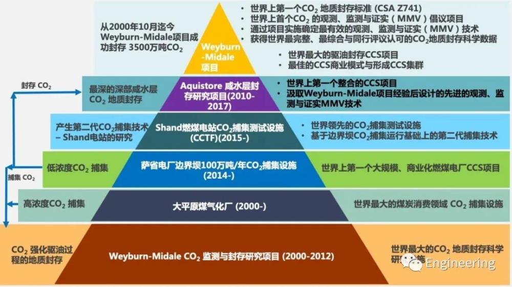 在CCS關(guān)鍵技術(shù)研發(fā)與示范中,西北大學(xué)的馬勁風(fēng)教授研究團隊認為先進國家CCS科技基礎(chǔ)研究設(shè)施的建立,成為其CCS技術(shù)源頭創(chuàng)新、成本降低、風(fēng)險降低、商業(yè)化推廣及人才培養(yǎng)的源泉。因此在分析對比國際CCS科技基礎(chǔ)研究設(shè)施特點的基礎(chǔ)上,重點分析了加拿大Weyburn-Midale項目從高濃度世界最大規(guī)模煤化工CO2捕集,到低濃度世界最大燃煤電廠年百萬噸CO2捕集的實施歷程與技術(shù)創(chuàng)新(圖1)。