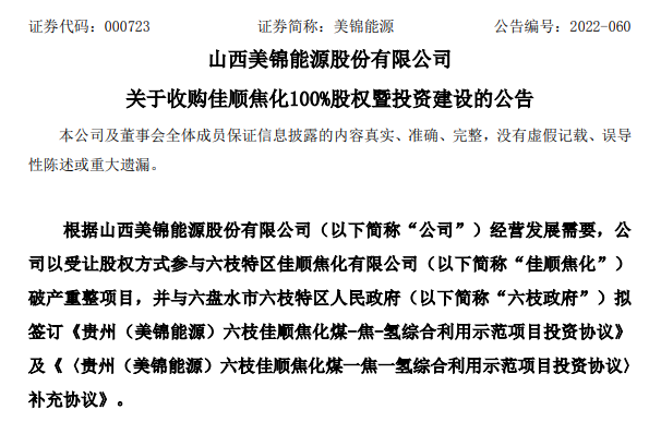 公告稱,公司以受讓股權(quán)方式參與貴州六盤水市六枝特區(qū)佳順焦化有限公司破產(chǎn)重整項(xiàng)目,公司擬提供2.4億元償債資金,獲取佳順焦化剝離掉低效資產(chǎn)后的100%股權(quán)。并與六枝政府?dāng)M簽訂《貴州(美錦能源)六枝佳順焦化煤-焦-氫綜合利用示范項(xiàng)目投資協(xié)議》相關(guān)補(bǔ)充協(xié)議。該項(xiàng)目主要是公司在貴州六盤水市落地投資建設(shè)煤-焦-氫綜合利用示范項(xiàng)目,擬投資金額不超過45億元。