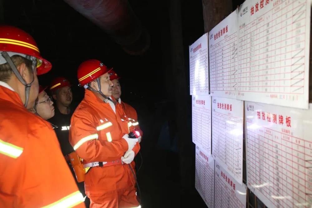到礦后,胡海軍一行直奔安全生產(chǎn)指揮中心,認(rèn)真查看玉溪煤礦采掘平面、瓦斯地質(zhì)和抽采系統(tǒng)等圖紙,仔細(xì)翻閱瓦斯抽采與防治各類數(shù)據(jù)登記臺賬,詳細(xì)詢問采掘布置、瓦斯抽采和防突措施等瓦斯治理情況、采掘接續(xù)及近期安全生產(chǎn)情況。隨后親自帶隊深入井下1304底抽巷、1302工作面及1301綜采工作面等采掘作業(yè)一線,督導(dǎo)檢查瓦斯治理、生產(chǎn)組織、現(xiàn)場安全管理、安全生產(chǎn)標(biāo)準(zhǔn)化建設(shè)及各項安全措施落實情況。