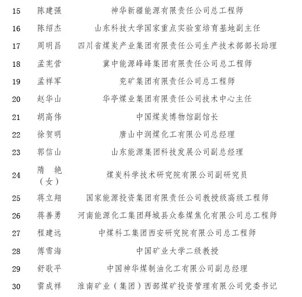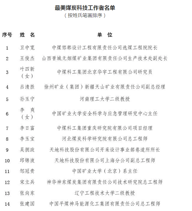 各有關(guān)單位: 在中華人民共和國(guó)成立70周年之際,為深入貫徹習(xí)近平新時(shí)代中國(guó)特色社會(huì)主義思想,大力實(shí)施創(chuàng)新驅(qū)動(dòng)發(fā)展戰(zhàn)略和人才強(qiáng)國(guó)戰(zhàn)略,激發(fā)廣大煤炭科技工作者的創(chuàng)新創(chuàng)造熱情,根據(jù)《中共中央宣傳部、中國(guó)科協(xié)、科技部、中國(guó)科學(xué)院、中國(guó)工程院、國(guó)防科工局關(guān)于開(kāi)展2019年"最美科技工作者"學(xué)習(xí)宣傳活動(dòng)的通知》(科協(xié)發(fā)調(diào)字〔2019〕20號(hào)),中國(guó)煤炭學(xué)會(huì)開(kāi)展了2019年最美煤炭科技工作者評(píng)選工作。 本次評(píng)選,煤炭企事業(yè)單位選拔推薦了104位候選人,學(xué)會(huì)組織了評(píng)審委員會(huì),通過(guò)初審、復(fù)評(píng)及公示,經(jīng)中國(guó)煤炭學(xué)會(huì)黨委和學(xué)會(huì)第七屆理事會(huì)2019年通訊會(huì)議通過(guò),評(píng)選出最美煤炭科技工作者30名(附件),予以宣傳表彰。 30位受表彰者,來(lái)自煤炭科研生產(chǎn)一線和各專業(yè)領(lǐng)域。在他們身上體現(xiàn)了煤炭科技工作者愛(ài)黨愛(ài)國(guó)、甘于奉獻(xiàn)的社會(huì)主義價(jià)值觀,展示了勇于探索創(chuàng)新、艱苦攻關(guān)克難,甘為人梯育人的時(shí)代精神,具有良好的示范作用。希望廣大煤炭科技工作者以他們?yōu)榘駱?,做重大科研成果的?chuàng)造者、建設(shè)科技強(qiáng)國(guó)的奉獻(xiàn)者、崇高思想品格的踐行者、良好社會(huì)風(fēng)尚的引領(lǐng)者,為建設(shè)世界科技強(qiáng)國(guó)、實(shí)現(xiàn)中華民族偉大復(fù)興中國(guó)夢(mèng)作出更大貢獻(xiàn)。