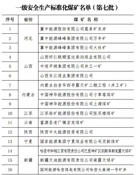這16處煤礦達(dá)到一級安全生產(chǎn)標(biāo)準(zhǔn)化標(biāo)準(zhǔn),正式公布