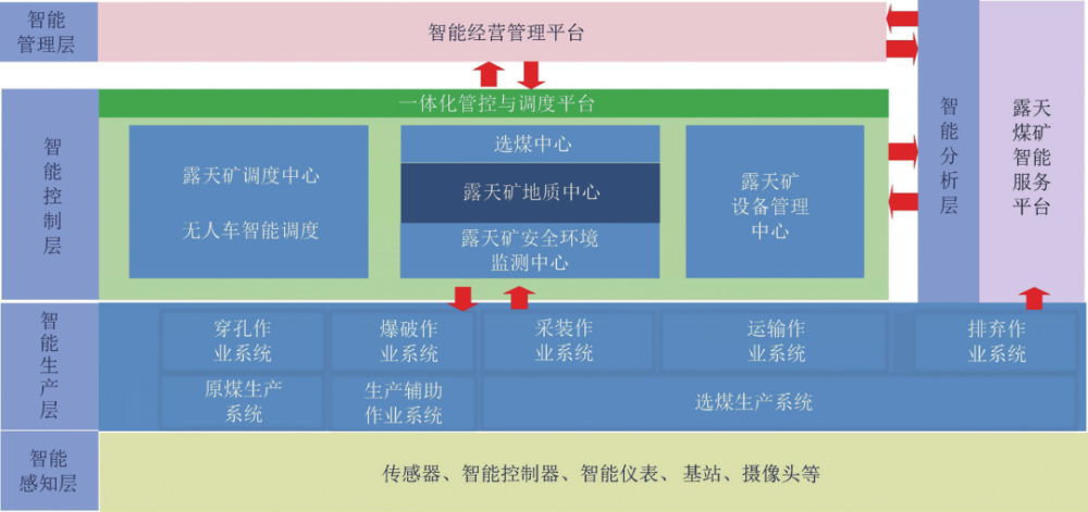 智能化露天礦的建設(shè)就是將信息化技術(shù)與露天煤炭工業(yè)的深度融合,形成全面感知、實(shí)時(shí)互聯(lián)、分析決策、自主學(xué)習(xí)、動(dòng)態(tài)預(yù)測(cè)、協(xié)同控制的智能系統(tǒng),通過(guò)設(shè)計(jì)、生產(chǎn)、安全、管理等工作的信息化和礦山機(jī)械的智能化,進(jìn)而實(shí)現(xiàn)露天礦山生產(chǎn)安全、勞動(dòng)生產(chǎn)率的大幅提高,以及整體生產(chǎn)成本的大幅降低,實(shí)現(xiàn)整個(gè)礦山的綠色、安全、高效、無(wú)人或少人化開(kāi)采。