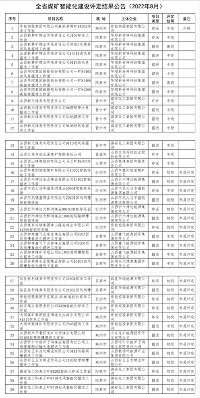 經(jīng)朔州市、陽(yáng)泉市等能源局申請(qǐng),省能源局按照規(guī)定組織專(zhuān)家對(duì)晉能控股集團(tuán)有限公司麻家梁煤礦14502綜采工作面等15個(gè)智能化建設(shè)項(xiàng)目進(jìn)行了現(xiàn)場(chǎng)評(píng)定;忻州市、呂梁市等能源局按文件規(guī)定對(duì)山西華鹿陽(yáng)坡泉煤礦有限公司10202智能綜放工作面等24個(gè)煤礦智能化建設(shè)項(xiàng)目進(jìn)行了現(xiàn)場(chǎng)評(píng)定,現(xiàn)將符合《全省煤礦智能化建設(shè)基本要求及評(píng)分方法(試行)》的智能化項(xiàng)目予以公告。