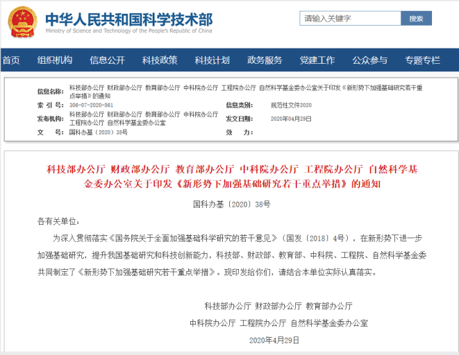 科技部網(wǎng)站刊發(fā)了《科技部辦公廳 財(cái)政部辦公廳 教育部辦公廳 中科院辦公廳 工程院辦公廳 自然科學(xué)基金委辦公室關(guān)于印發(fā)<新形勢(shì)下加強(qiáng)基礎(chǔ)研究若干重點(diǎn)舉措>的通知》。通知稱為實(shí)現(xiàn)我國(guó)的前瞻性基礎(chǔ)研究、引領(lǐng)性原創(chuàng)成果重大突破,特提出五大方面10個(gè)重點(diǎn)舉措,針對(duì)性強(qiáng),也有很多新提法: