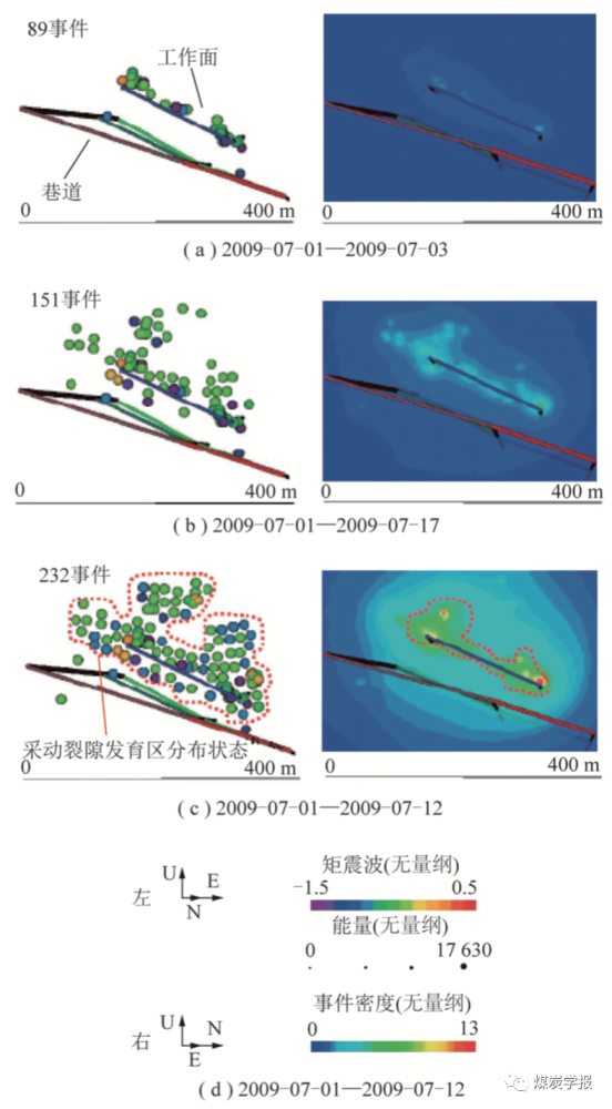 圖 5 采動裂隙場形成過程中微震事件及其等值密云圖的演化規(guī)律