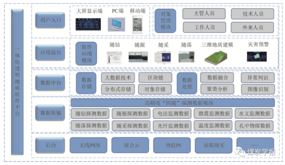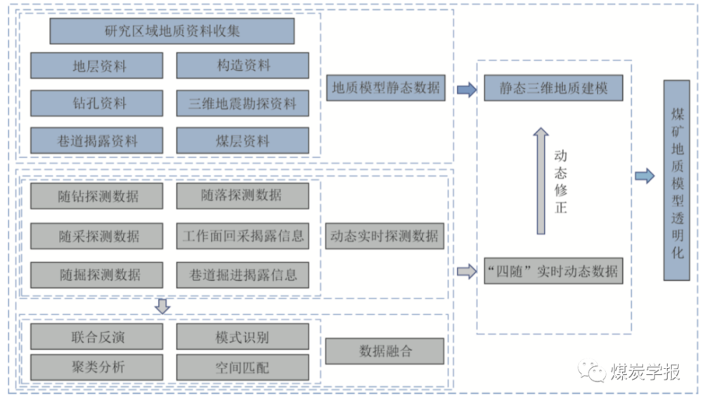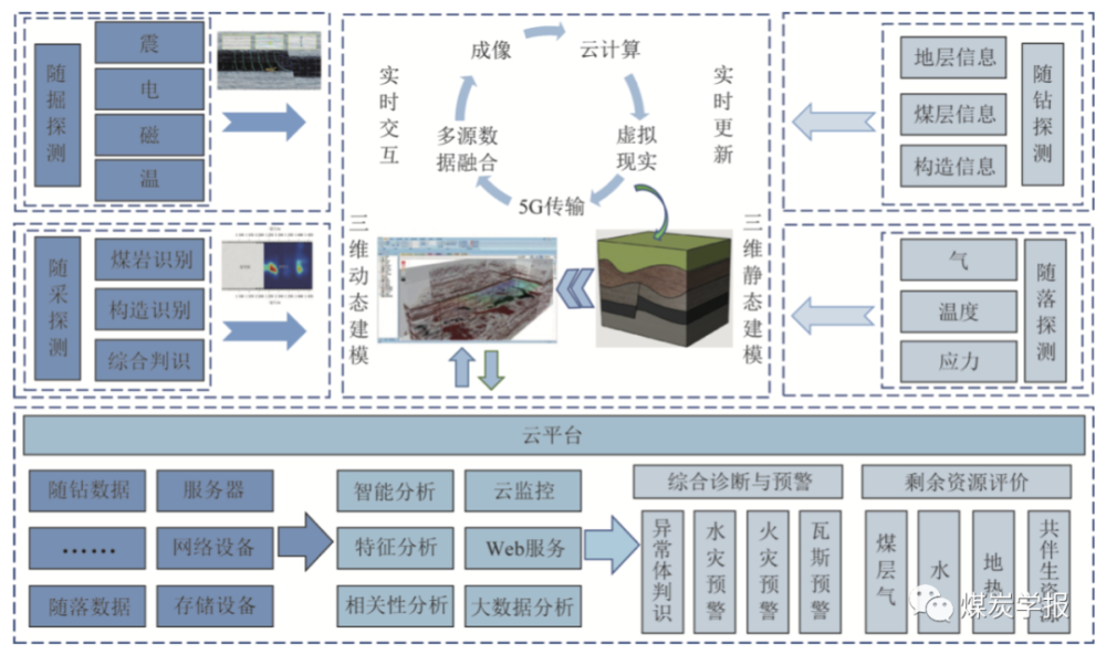 基于“四隨”動態(tài)高精度探查技術,進一步研發(fā)地層、構造、采場、資源等多源地質(zhì)地球物理場數(shù)據(jù)信息融合技術,通過“四隨” 探測數(shù)據(jù)實時獲取與融合處理,提高地質(zhì)信息實時感知與交互能力,輔以虛擬可視、成像等技術,實時修正靜態(tài)地質(zhì)模型,完成動態(tài)地質(zhì)模型重構,逐步實現(xiàn)煤礦地質(zhì)條件的全透明化。通過構建煤礦生產(chǎn)全生命周期智能化信息平臺,實現(xiàn)云端信息綜合診斷和預警互助,為智能化煤礦建設及資源化評價利用提供可靠的技術支撐。