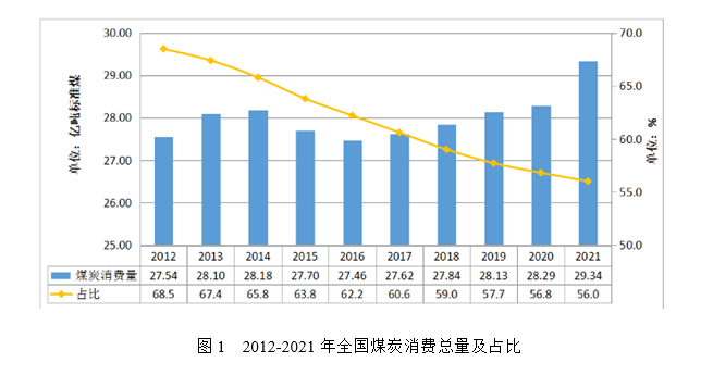 我國能源稟賦呈現(xiàn)“富煤、貧油、少氣”的特點,以煤為主的能源結構短期內難以根本改變[1]。過去10年,煤炭消費量占一次能源消費比重下降了12.5個百分點,但2021年煤炭消費量仍占能源消費總量的56%(見圖1)。煤炭作為我國主體能源,需要按照綠色低碳的發(fā)展方向,對標實現(xiàn)碳達峰、碳中和目標任務,立足國情、控制總量、兜住底線,有序減量替代,推進煤炭產業(yè)轉型升級。煤礦智能化是實現(xiàn)煤炭產業(yè)轉型升級和高質量發(fā)展的核心技術支撐。近年來,我國煤礦智能化建設呈現(xiàn)加速推進的態(tài)勢,但部分企業(yè)、部分煤礦智能化面臨推進難、推進慢等局面。因此,客觀分析煤礦智能化建設現(xiàn)狀,找出煤礦智能化建設中存在的問題,制定推進煤礦智能化建設高質量發(fā)展的措施建議,對于實現(xiàn)煤炭產業(yè)轉型升級具有重要意義。