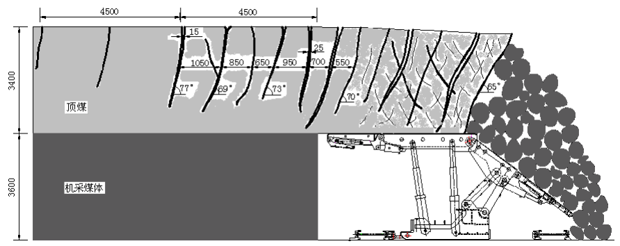 與普通采高綜放工作面相比,大采高綜放開采頂煤開始張裂的位置前移了1m左右,張裂縫的傾角增大3°,頂煤的垮落角增大15°,張裂縫切割頂煤的間距減小約500mm,相同位置的裂縫寬度也有所增加。