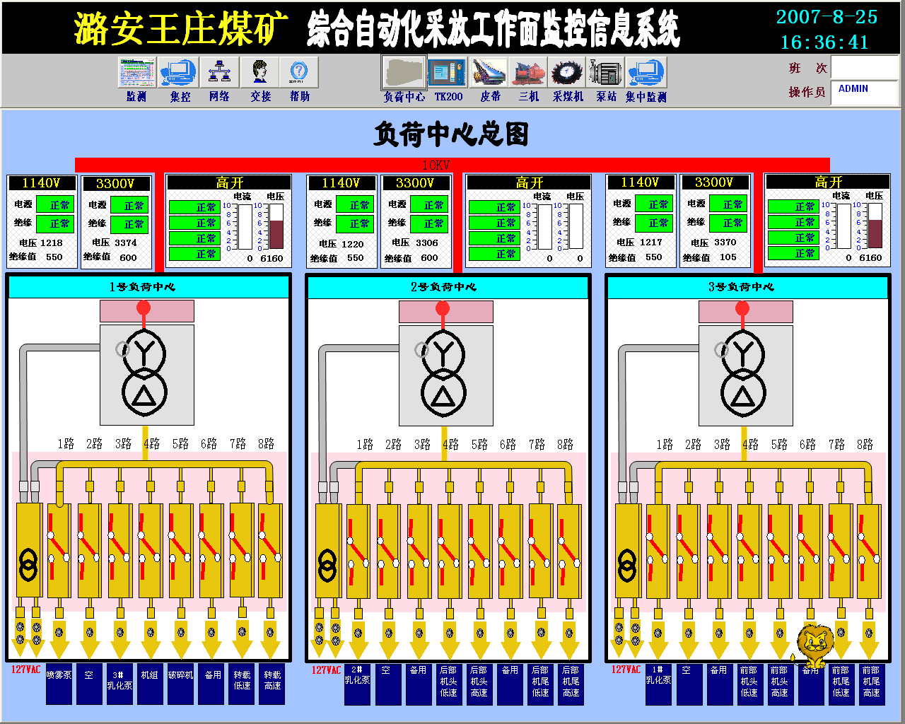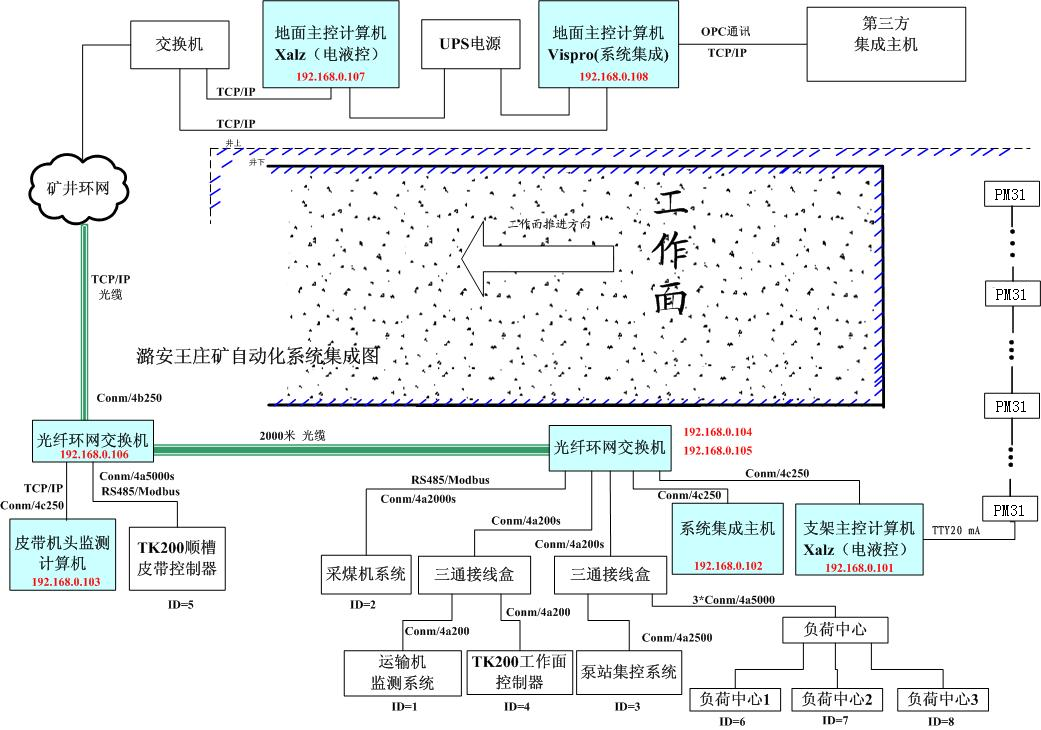 (2)首次將電液控制技術(shù)應(yīng)用于大采高四柱支撐掩護(hù)式綜放設(shè)備;首次采用本安型工業(yè)以太網(wǎng)技術(shù),通過Modbus/TCP總線、標(biāo)準(zhǔn)的OPC接口,實(shí)現(xiàn)了系統(tǒng)控制臺(tái)對(duì)工作面設(shè)備的集中控制,實(shí)現(xiàn)了綜放工藝自動(dòng)化。實(shí)現(xiàn)了主運(yùn)輸、供電設(shè)備的地面集中控制,無人值守。