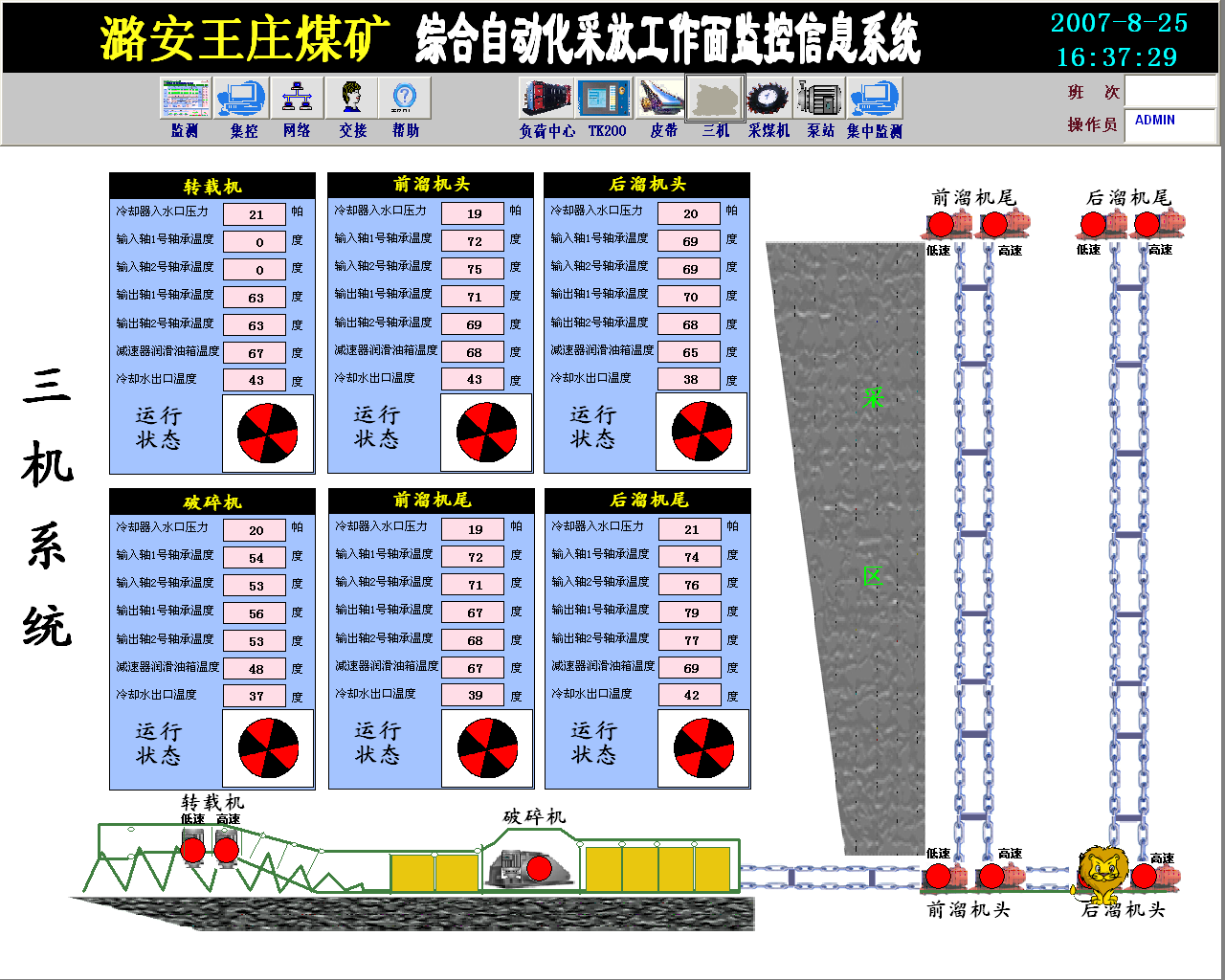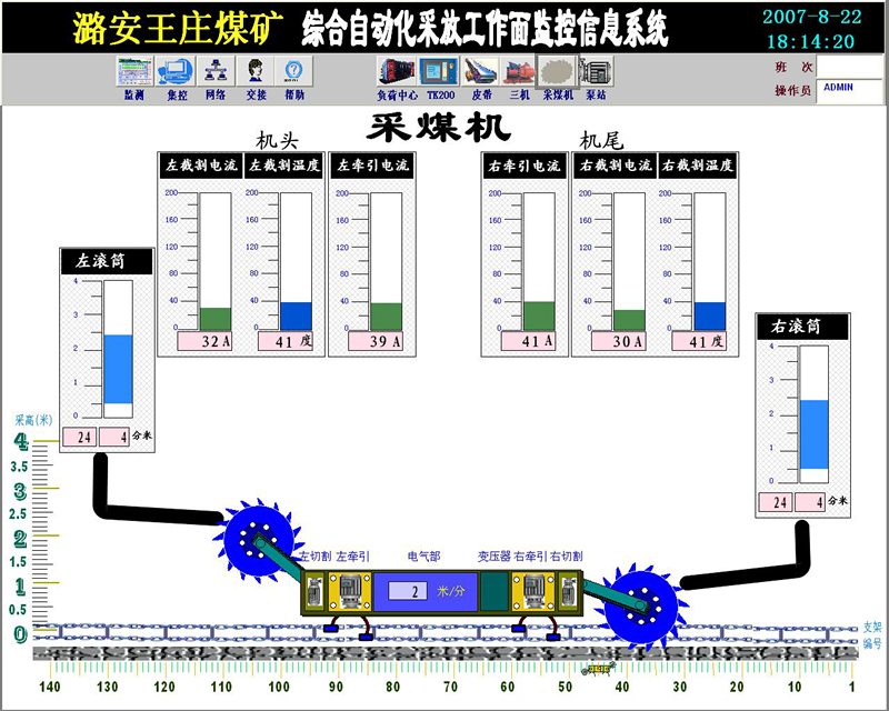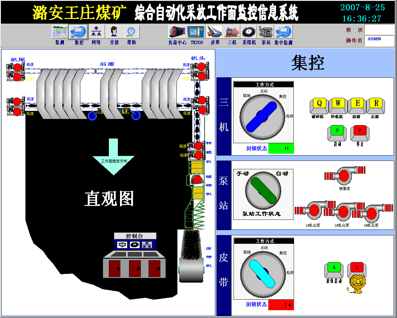將電液控制技術(shù)應(yīng)用于大采高四柱支撐掩護(hù)式綜放設(shè)備,采用漢字顯示,開發(fā)適合于采放工藝要求的自動(dòng)跟機(jī)控制程序,達(dá)到采放平衡。采用本安型工業(yè)以太網(wǎng)技術(shù),通過Modbus/TCP總線、標(biāo)準(zhǔn)的OPC接口,實(shí)現(xiàn)系統(tǒng)控制臺(tái)對(duì)工作面設(shè)備的集中控制,實(shí)現(xiàn)了綜放工藝自動(dòng)化。實(shí)現(xiàn)主運(yùn)輸、供電設(shè)備的地面集中控制,無人值守。大幅度提高綜放工作面及環(huán)節(jié)系統(tǒng)自動(dòng)化水平、安全可靠性,達(dá)到減人提效的目的。