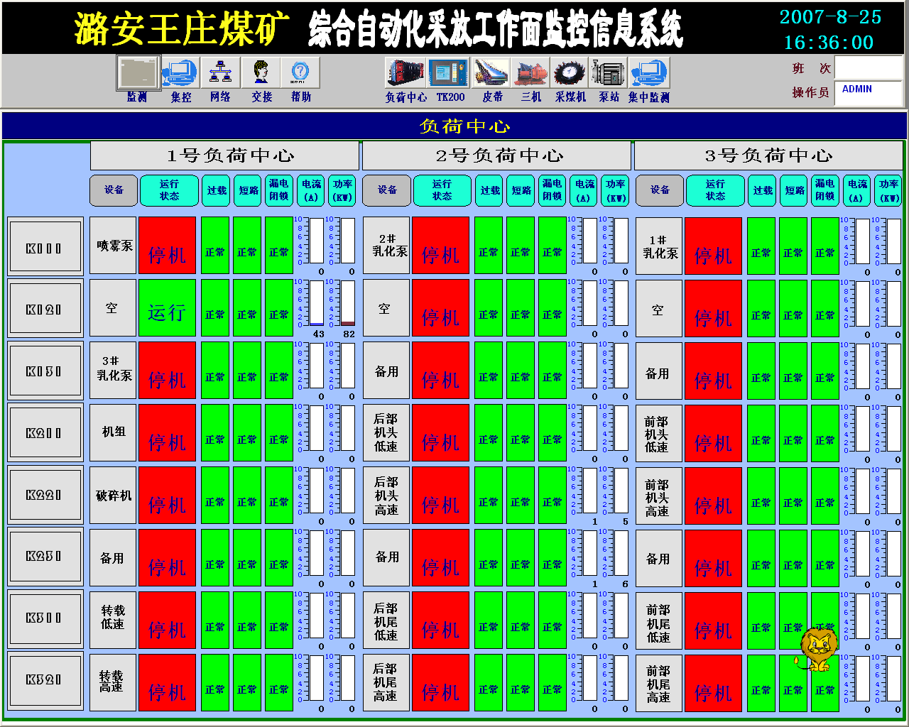 6203大采高自動(dòng)化綜放工作面設(shè)備選型配套有如下特點(diǎn):(1)增大了工作面刮板機(jī)配套功率,并使用雙速電機(jī),刮板鏈型號(hào)提高,有效減少了斷鏈和傳動(dòng)部事故的發(fā)生;(2)自行研制并成功使用了采煤機(jī)截割滾筒內(nèi)噴霧裝置,有效降低了工作面煤塵濃度,改善了工作面環(huán)境;(3)工作面配套使用了大功率移變,并實(shí)行雙回路供電和備用回路帶電熱備用,提高了工作面供電可靠性;(4)選用大流量乳化液泵站,實(shí)行雙泵雙回路供液,提高工作面支架供液系統(tǒng)的流量、壓力;(5)工作面安裝TK-200通訊控制一體化系統(tǒng),實(shí)現(xiàn)了對(duì)關(guān)鍵設(shè)備的集中控制和負(fù)荷檢測(cè)。