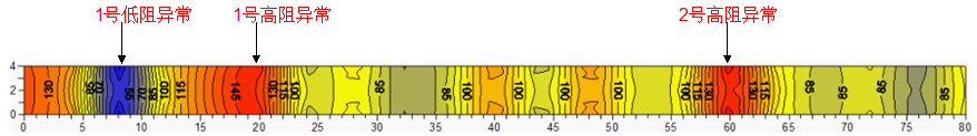 1、本次探測超前距離為80米,最低值為40,最高值為155。 2、探測范圍內(nèi)發(fā)現(xiàn)1處低阻異常和2處高阻異常 經(jīng)驗證:通過施工鉆孔,施工6.5m,發(fā)現(xiàn)有水,并對其釋放,共放水1060m3,巷道掘進(jìn)至60m處,發(fā)現(xiàn)有一落差為4.3m的斷層。 |
