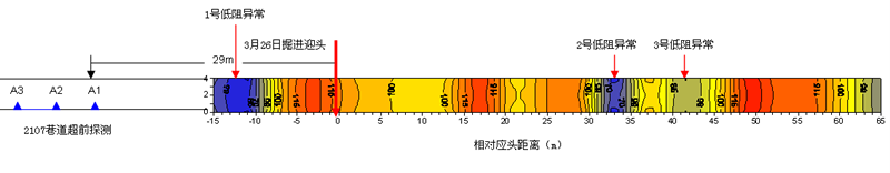 1、2107巷道超前探測控制距離94米,實測距離65米。 2、在迎頭后方發(fā)現(xiàn)1處低阻異常;迎頭后方發(fā)現(xiàn)2處低阻異常。 經(jīng)驗證:巷道掘進(jìn)至前方32米,巷道頂板施工錨索時,錨索孔有淋水。 |