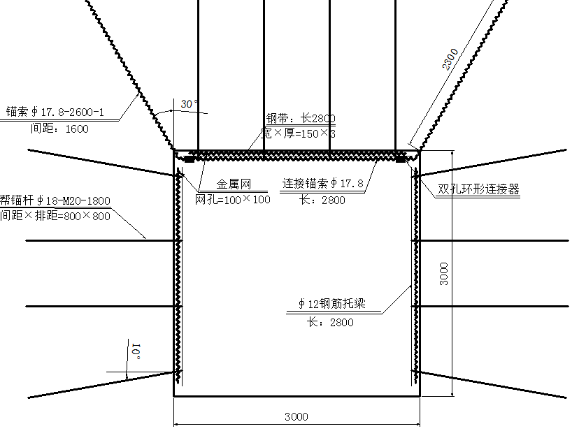 金屬網(wǎng)規(guī)格:采用金屬網(wǎng)片護頂,網(wǎng)片規(guī)格為1500×2500 mm,網(wǎng)格規(guī)格為100×100mm。網(wǎng)間搭接長度不小于100mm,用雙股14#鉛絲按不大于300mm的間隔連接牢固。