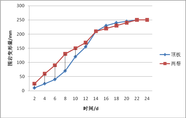 在觀測的1個月中,兩幫最大移近量小于164mm,頂板最大下沉量小于235mm。巷道初期收斂速度比后期收斂速度要大,兩幫經(jīng)過10天左右巷道收斂速度就趨于穩(wěn)定,頂板需要較長時間,經(jīng)過20天左右時間以后才趨于穩(wěn)定?,F(xiàn)場實踐證明巷道圍巖控制效果較好。