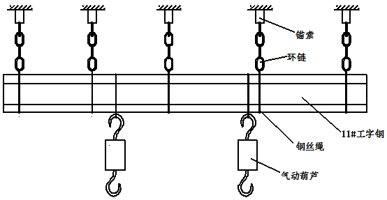 JND M63D型氣動(dòng)葫蘆安裝于我礦8210工作面尾巷5210巷距工作面30米的位置,挑頂留出足夠的起吊高度。具體安裝方法為:在頂板上打一定數(shù)量的錨索,將工字鋼通過環(huán)鏈固定于錨索上,共需2根3米左右的工字鋼,每根工字鋼約需10組(共20根)錨索。然后將JND M63D型氣動(dòng)葫蘆通過鋼絲繩固定在工字鋼上(共需4臺(tái)氣動(dòng)葫蘆,每根工字鋼上固定2臺(tái))。安裝的關(guān)鍵之處在于:工字鋼垂直順槽固定,調(diào)節(jié)2根工字鋼的間距和支架頂梁展開時(shí)吊耳間距相符;然后調(diào)節(jié)好2臺(tái)氣動(dòng)葫蘆間距正好滿足支架頂梁吊耳的間距(約1.5米),每根工字鋼的具體安裝示意圖如圖1所示。