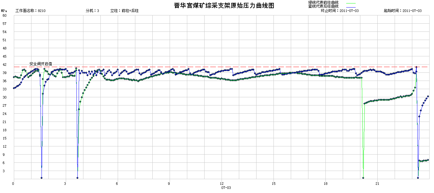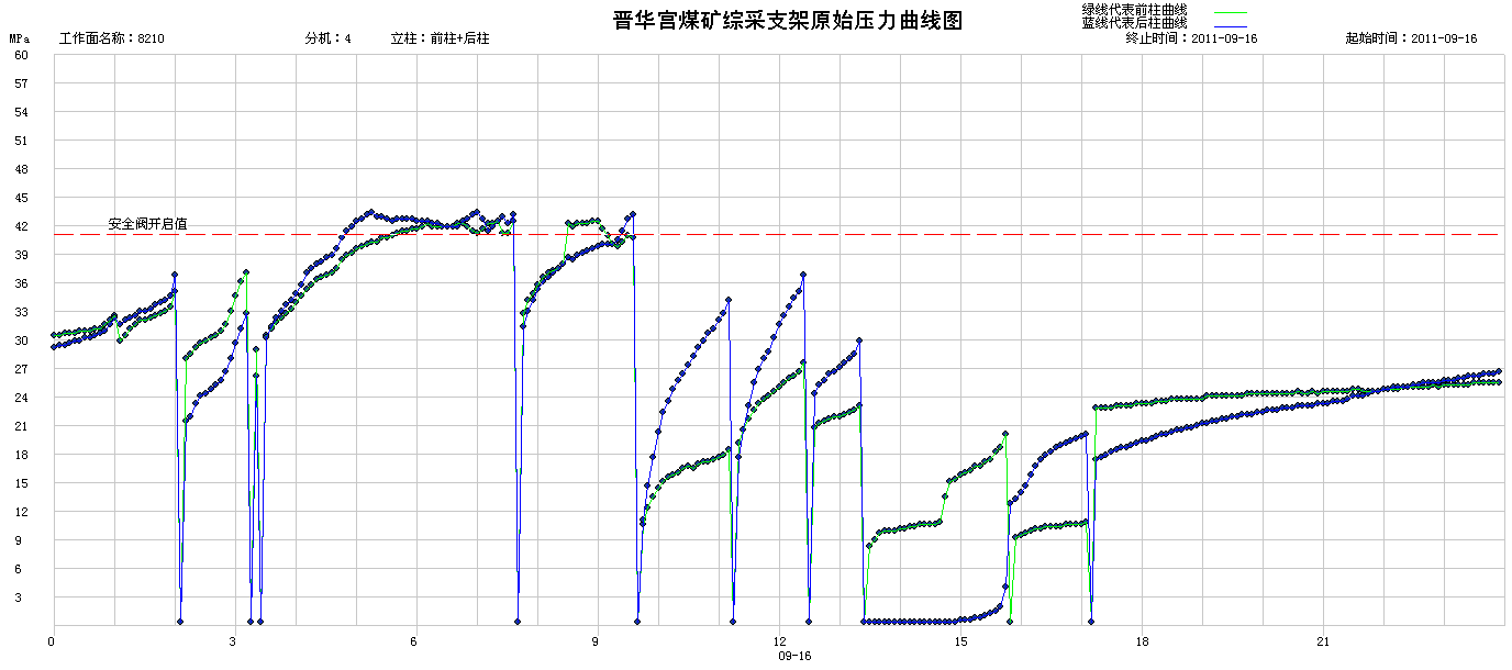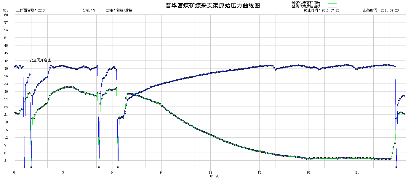 ③當(dāng)工作面采至160米時(shí),2011年7月28日,工作面周期來壓,40#架—80#架礦壓顯現(xiàn)明顯,安全閥開啟多次,最大工作阻力顯示42Mpa。