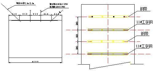 ③、鋼梁棚:錨索梁為11#礦用工字鋼,長有3.2m、3.6m、3.7m三種,孔距2600mm;鋼梁腿為11#礦用工字鋼,與鋼梁搭接的兩端處焊14#槽鋼且槽口端焊接鋼筋加固,腿凈長滿足需要,腿腳焊接100×100×10mm的鋼板。