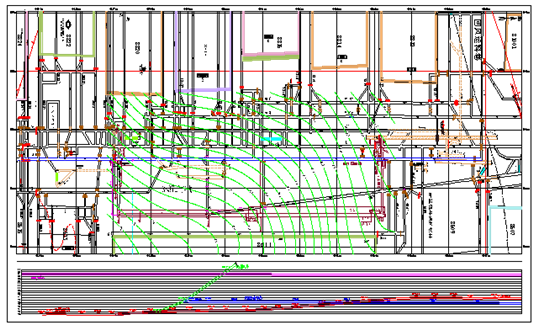 ②地質科提前在空巷頂板給出2637巷變更后3.5m斷面的中線,以及在空巷頂板上距西幫走向線以東0.5m處鋼梁位置線。