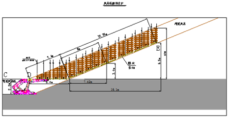 ⑤在鋼梁西側0.3m處由南向北依次打設“井”字垛,“井”字垛間距為0.2m,打設“井”字垛使用1.5×0.2×0.2m道木。每兩個“井”字垛之間間隔20公分?!熬弊侄獯蛑僚c鎖口鋼梁同一位置。