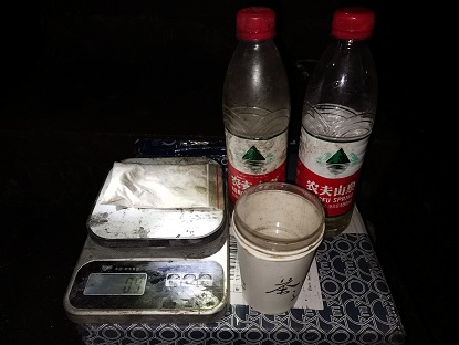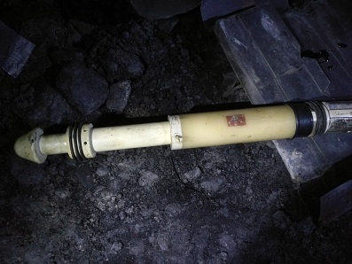 打空心包體孔。利用自備的錐形鉆頭(直徑為127mm,圖4),其上帶有長360mm,直徑36mm的小鉆頭,打同心小孔并取巖芯,同時(shí)將孔底磨平,并用錐形鉆頭打出70mm長的喇叭口,小孔深360mm。此小孔一次性打到底,鉆孔過程中,必須利用1m長巖芯管定向。 沖洗鉆孔。小孔成形后,抽出鉆桿50mm,用鉆機(jī)的水管沖洗。 (2)安裝空心包體 清洗和干燥鉆孔:在洗孔器上纏上棉紗(直徑略大于36mm),倒上丙酮,利用安裝桿將洗孔器送到孔底進(jìn)行鉆孔干燥清洗一至兩遍,并記錄洗孔器進(jìn)入孔底時(shí)鉆桿外露長度及洗孔器長度。 配制環(huán)氧膠(圖6)。用注射器和托盤天平嚴(yán)格量取環(huán)氧膠47克,固化劑8.4克,置于燒杯內(nèi),混合均勻。將配制好環(huán)氧膠倒入應(yīng)力計(jì)的空腔,用牙簽固定好柱塞(圖7)。 安裝空心包體。先用砂紙把空心包體表面尤其是應(yīng)變片位置打磨掉1mm左右的厚度,然后在定位器的定位槽中涂抹好黃油,將空心包體安裝到定位器上,確定A應(yīng)變片豎直向上后用安裝桿細(xì)心的將包體送到預(yù)定位置,推斷固定銷牙簽,將環(huán)氧膠從包體內(nèi)腔擠出使空心包體與鉆孔壁膠合。并測(cè)量鉆桿外露長度,確定牙簽斷掉,環(huán)氧膠已完全擠出。 專人保護(hù)。設(shè)專人看守,防止誤碰外露鉆桿,影響空心包體與巖壁膠合。