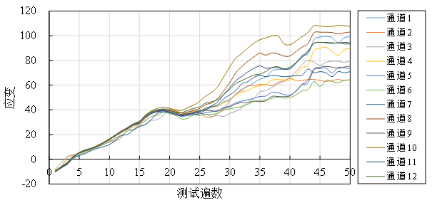 (2)測(cè)量孔的解除曲線在測(cè)量工作中,應(yīng)力解除過程都比較正常,并能取出帶有應(yīng)力計(jì)的完整巖心。應(yīng)力解除完成后根據(jù)應(yīng)變儀的讀數(shù),分布繪制出各測(cè)點(diǎn)的應(yīng)力解除曲線,并由繪制出的應(yīng)力解除曲線得出各個(gè)應(yīng)變的穩(wěn)定應(yīng)變值。 2020年11月10日在通404-2盤區(qū)軌道暗斜井2#煤躲避硐室進(jìn)行了測(cè)量,A應(yīng)變片豎直向上,應(yīng)變片深度為800cm,解除過程中應(yīng)用應(yīng)力計(jì)的12個(gè)應(yīng)變片隨解除距離的應(yīng)變變化曲線詳見應(yīng)力解除曲線(圖12)。 從圖中可以看出,解除開始至解除距離28cm階段,應(yīng)變曲線平緩,應(yīng)變隨解除距離的變化幅度很小,說明鉆頭未推進(jìn)至應(yīng)變片位置;當(dāng)解除距離至28cm后,應(yīng)變量逐漸增加,當(dāng)解除至應(yīng)變片位置即解除距離達(dá)30cm時(shí),應(yīng)變量突然增加,隨后應(yīng)變曲線趨于平緩,解除至40cm后,應(yīng)變量基本不變,解除至45cm時(shí),應(yīng)變解除結(jié)束。應(yīng)變解除曲線正常,可作為計(jì)算應(yīng)力的依據(jù)。