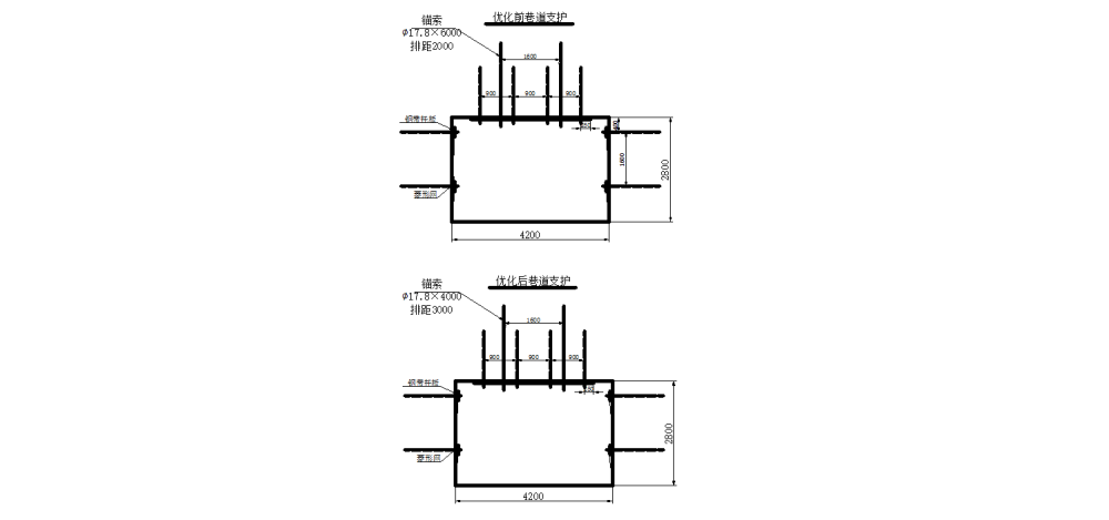 4、優(yōu)化支護(hù)形式 三、主要創(chuàng)新點(diǎn)及結(jié)論通過對(duì)云崗礦原巖應(yīng)力現(xiàn)場(chǎng)測(cè)定,再根據(jù)實(shí)測(cè)結(jié)果對(duì)其進(jìn)行的反演,得到了2#煤測(cè)點(diǎn)處的三維地應(yīng)力狀態(tài)。對(duì)礦井以后的地下工程設(shè)計(jì)和施工有很大的幫助。綜合分析礦區(qū)原巖應(yīng)力測(cè)定研究成果和地應(yīng)力反演結(jié)果,我們得到了以下結(jié)論: (1)通過實(shí)測(cè)得到了云崗礦2#煤測(cè)試區(qū)域地應(yīng)力分布的大小及方向。得出2#煤測(cè)試區(qū)域主應(yīng)力空間分布規(guī)律,確定巷道布置沿最小主應(yīng)力方向平行受力最小,將2#層盤區(qū)主要巷道沿最小主應(yīng)力方向布置,保證了安全生產(chǎn)。 (2)另外,通過直接頂取芯結(jié)果,確定2#層頂板為含礫粗砂巖,較堅(jiān)硬,完整性好。 通過以上兩點(diǎn)結(jié)論,我們優(yōu)化2#層巷道支護(hù),頂板支護(hù)中將原設(shè)計(jì)6m錨索優(yōu)化為4m錨索,排距由原2m兩根擴(kuò)大到3m兩根,錨桿支護(hù)由1.8m改為1.5m,間排距按原設(shè)計(jì),2#層巷道共計(jì)5000m,為云崗礦減少了可觀的成本支出。 四、經(jīng)濟(jì)社會(huì)效益 1、經(jīng)濟(jì)效益 優(yōu)化巷道支護(hù)方面:頂板支護(hù)由原來的2m排距2根錨索,改為3m排距2根錨索支護(hù),每米巷道節(jié)省4m錨索材料支出,錨索成本9元/m,巷道節(jié)省36元/m; 人工投入方面:云崗礦目前采用“四·六”制作業(yè)方式,依據(jù)目前各掘進(jìn)隊(duì)組單進(jìn)水平能力,每班次可掘進(jìn)進(jìn)尺為6米。支護(hù)優(yōu)化后每班次可節(jié)約5根錨索(按長度計(jì)算20m),按四人支護(hù)作業(yè),可節(jié)省一半工作量,人均300元工資結(jié)算,每米可節(jié)省人工投入150元。 巷道優(yōu)化設(shè)計(jì)后,每米巷道材料和人工投入共可節(jié)省186元,2#層共計(jì)可減少支出93萬元。 考慮優(yōu)化支護(hù)后,掘進(jìn)單進(jìn)由6m加快到8m,預(yù)計(jì)提前7個(gè)月圈出工作面,每月按月產(chǎn)3萬噸計(jì)算,可多出煤炭21萬噸,噸煤200元計(jì)算,可產(chǎn)生經(jīng)濟(jì)效益4200萬元。 2、社會(huì)效益 通過對(duì)云崗礦原巖應(yīng)力現(xiàn)場(chǎng)測(cè)定,分析原巖應(yīng)力方向分布,合理優(yōu)化巷道布置方式及優(yōu)化巷道支護(hù)形式,減少了支護(hù)工程量,節(jié)約了成本,保證礦井安全生產(chǎn)。 五、推廣應(yīng)用前景 云崗礦堅(jiān)硬頂板地應(yīng)力測(cè)試及分布的應(yīng)用實(shí)踐后,不僅僅在于該項(xiàng)目采用了“應(yīng)力解除法”先進(jìn)地應(yīng)力測(cè)試技術(shù),更重要的是通過地應(yīng)力測(cè)試科學(xué)合理的布置巷道和優(yōu)化支護(hù)設(shè)計(jì),可以省去諸多管理環(huán)節(jié)、施工工序、工程費(fèi)用,屬云崗礦首例,集團(tuán)公司少有。通過在云崗礦井下3#現(xiàn)場(chǎng)試驗(yàn)成功,實(shí)踐證明了這種地應(yīng)力測(cè)試技術(shù)是可行的,并對(duì)類似條件下礦井有一定的借鑒,具有廣泛的推廣和應(yīng)用價(jià)值。